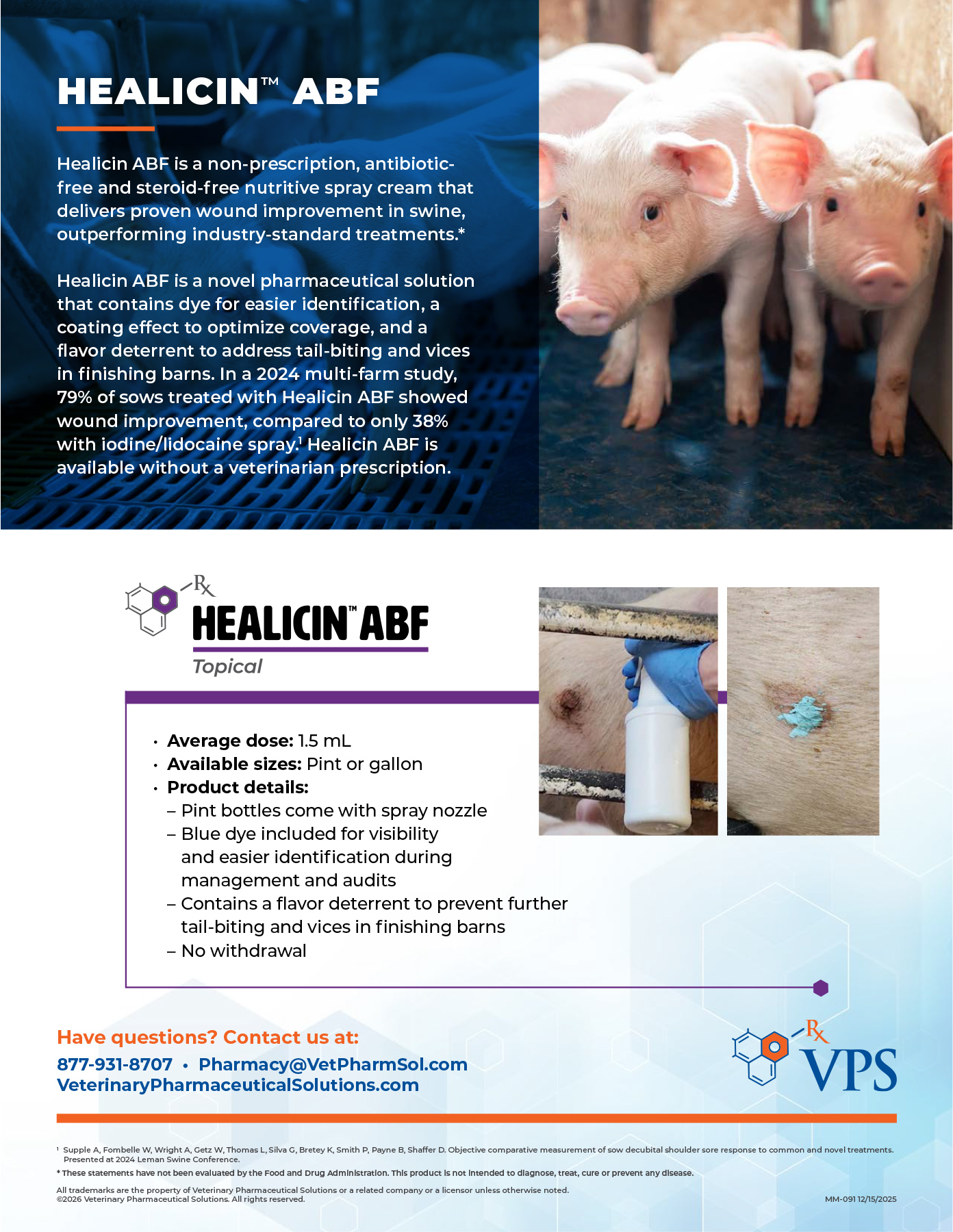 1 Supple A, Fombelle W, Wright A, Getz W, Thomas L, Silva G, Bretey K, Smith P, Payne B, Shaffer D. 2024. Objective comparative measurement of sow decubital shoulder sore response to common and novel treatments. Presented at 2024 Leman Swine Conference.