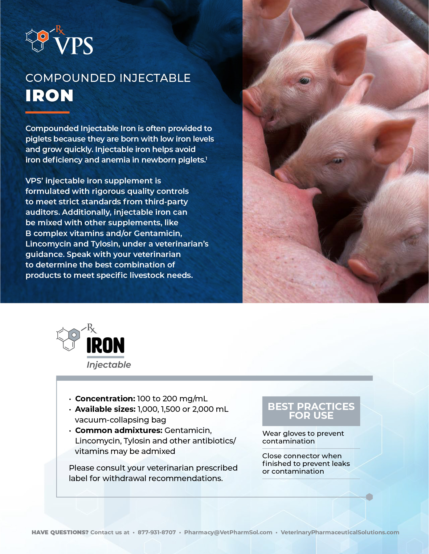VPS produces a range of compounded injectable products including supplemental iron. Iron is often provided to piglets because they are born with low iron and grow quickly. In addition, B complex vitamins and/or Gentamicin, Lincomycin and Tylosin are often provided along with injectable supplemental iron. Veterinarians determine the best combination of products to meet specific livestock needs.