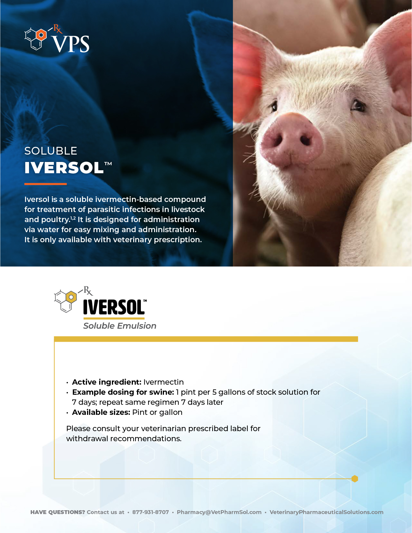 Ivermectin is indicated for the treatment of parasitic infestations in livestock, specifically those caused by mange mites and lice. Iversol™ is formulated as a soluble product that can be used through the water medicator and contains Ivermectin. Iversol is only available with veterinarian prescription.